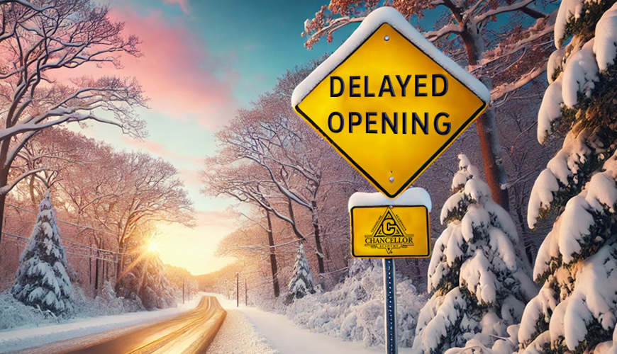 Dear Parents and Guardians, Due to inclement conditions, Chancellor Academy will have a delayed opening on Tuesday, December 2. School will begin at 10:00 instead of the regular start time. Please travel safely.